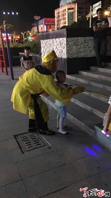 天天天水网18日8时讯(记者 刘晓亚)节会前美丽迷人的天水夜景同样诱惑了一位神仙——孙大圣,6月18日晚,大圣在仙界闲来无事,见天水夜景色彩斑斓,便一个筋斗云来到凡间,在市中心附近与民同乐,助兴节会。据了解,大圣是一位市民自娱自乐扮演的,那叫一个像,牛酷!