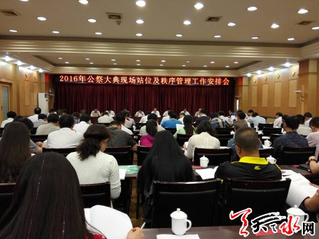 天天天水网18日10时讯(记者 李欣桐)6月18日上午, 我市召开2016年公祭大典现场站位及秩序管理工作安排会,会议汇报了公祭大典现场站位安排部署情况并就切实加强公祭大典现场站位和秩序管理提出了具体要求。