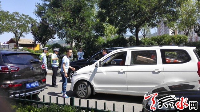 天天天水网18日8时讯(记者 王雪梅 )6月17日下午,记者在滨河路人民公园附近看到,两辆私家车发生刮蹭,导致交通拥堵。交警赶到事发现场后立即进行了勘查取证,事故归责,在短时间内得以解决,使拥堵的交通尽快恢复了畅通。
