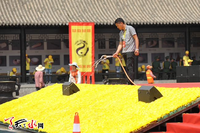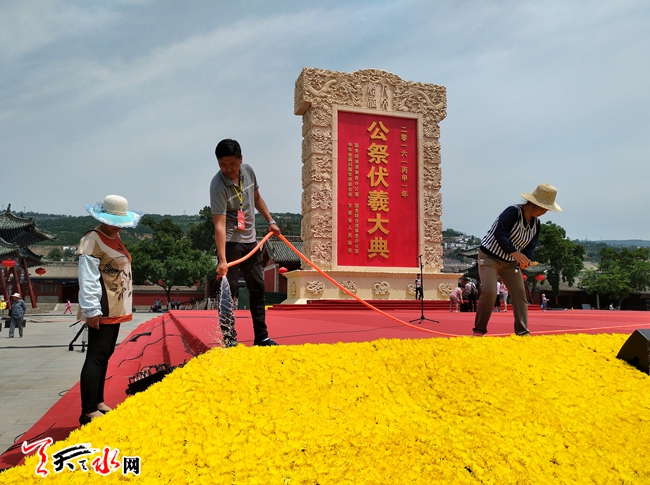 6月20日,工作人员正在为伏羲祭祀广场的菊花洒水。2016(丙申)年公祭伏羲大典举行在即,伏羲祭祀广场已搭建完成,凸显庄重、肃穆。(天水日报记者 孙镇 )