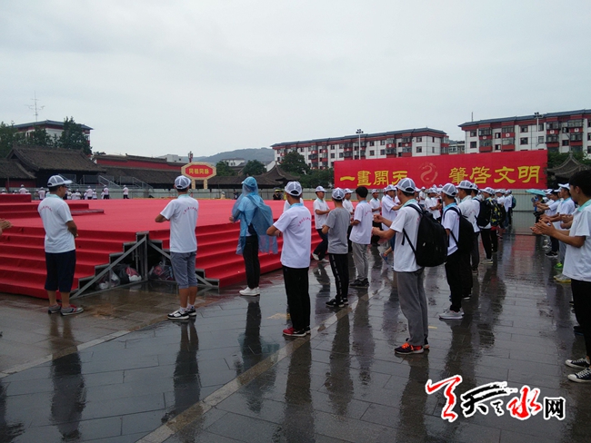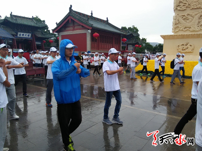 天天天水网21日10时讯【记者 何慧娟】6月21日上午,即使天气阴沉并伴着小到中雨,但在伏羲广场的祭祀台前,上百名彩排人员却在风雨无阻地进行彩排。他们踏着乐鼓声的节奏,秩序井然,目光坚定,阴雨天气丝毫没有影响到他们对人文始祖伏羲的虔诚。
