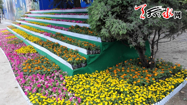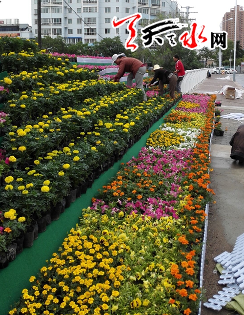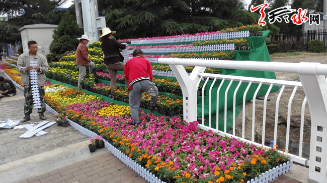 天天天水网21日15时讯 【记者 刘晓亚】6月21日,新建成的罗玉桥西头,园艺工人正在摆设花坛,娇艳的花朵,五彩色彩,与雄伟大气的桥梁相映成辉,为节日的天水频添了一道靓丽的风景。