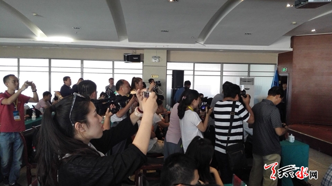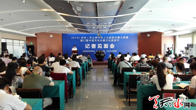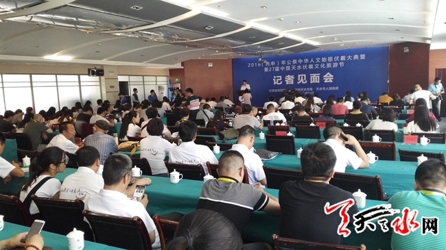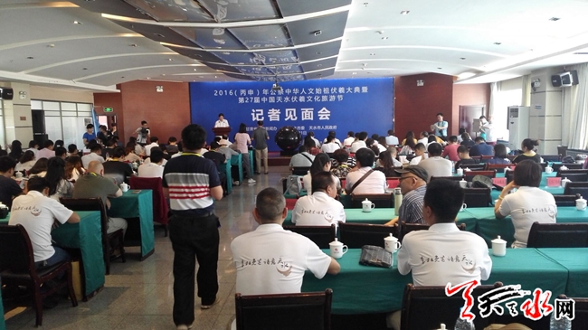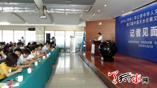 天天天水网21日16时讯 【记者 杨晓斌 李旺旺】由甘肃省政府新闻办,中共天水市委,天水市人民政府主办的2016(丙申)年公祭中华人文始祖伏羲大典暨第27届中国天水伏羲文化旅游节记者见面会在天水天辰大酒店召开。来自海内外的100多家媒体的记者参加了此次会议。