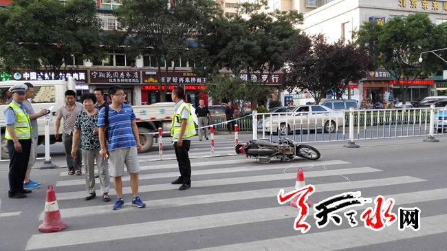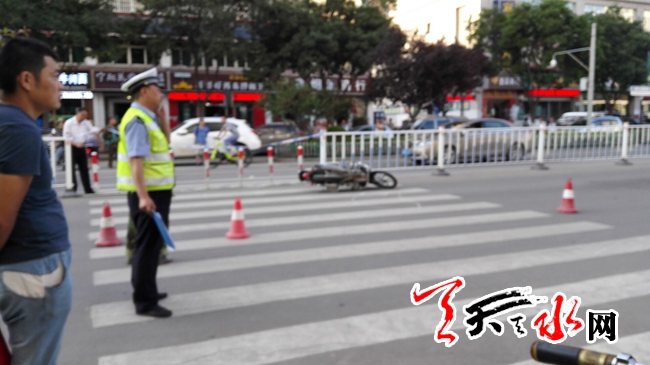 天天天水网21日20时讯【记者 苏中豹】21日傍晚,在秦州区人民路与重兴街的交汇路口以西的一条斑马线上,一辆摩托车倒在地上,交警正在勘查现场。