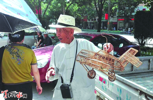 6月22日上午10时许,在秦州区解放路,一位老人提着一个飞机造型的蚂蚱笼,立即引起市民的围观,大家都说造型新颖、好看,纷纷拍照留念,还有一些市民询问蚂蚱笼的价格。