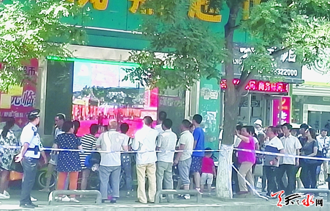 6月22日10时,在秦州区解放路一药店门口的一电子屏幕前,群众聚集在一起观看公祭伏羲大典现场直播。(天水日报记者 陈少娟 吕薇 摄)