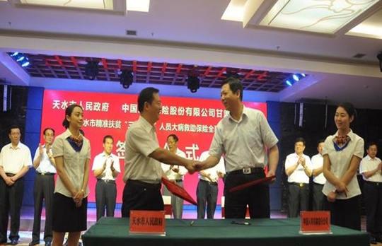 2016年6月21日,甘肃省委副书记欧阳坚,省委副秘书长刘玉生,省民政厅副厅长郭华锋,省住建厅副厅长郭明卿,省扶贫办副主任王海明,省政府金融办副主任李相毅,省保监局副局长潘波,中国人寿甘肃省分公司党委书记、总经理张举科及业务总监兼天水分公司党委书记、总经理李源良,天水市委书记王锐,市人大常委会主任柴金祥,市委常委、组织部长王光庆,市委常委、市委秘书长蒋晓强,市委常委、秦州区委书记雷鸣,副市长霍卫平、王钧、许强,市政府秘书长逯克宗,各县区党委政府主要领导、分管领导,市直有关部门领导出席签约仪式。