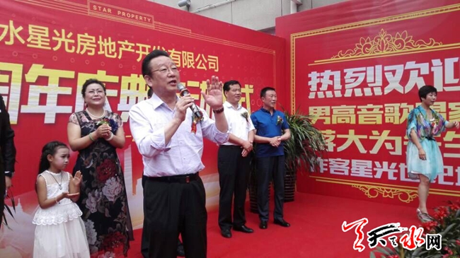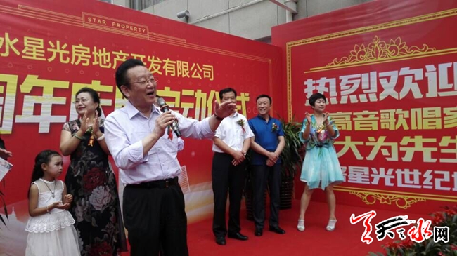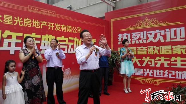 天天天水网24日12时讯【记者 张文都 蔚军平】6月24日,著名男高音歌唱家蒋大为先生一路风尘来到秦州区暖和湾的星光世纪城小区,参加天水星光房地产开发有限公司10周年庆典启动仪式。
