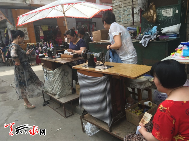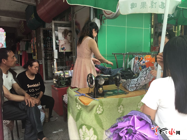 天天天水网24日16时讯【记者 裴婷婷】6月24日下午16时许,在秦州区商业城楼下,记者看到不少修改衣物的小摊,此时虽是上班时间,但能看到各个小摊的生意依旧红火,四周围坐着不少正在等待的消费者。
