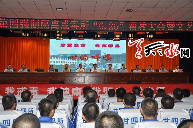 又讯 6月24日下午,第四强制隔离戒毒所联手甘肃林业职业技术学院在国际禁毒日来临之际,举办“6.26”“我戒毒、我健康、我阳光、我幸福”帮教活动,向毒品宣战,共同放飞梦想、共同向明天歌唱。