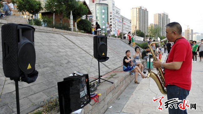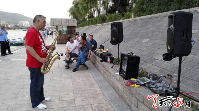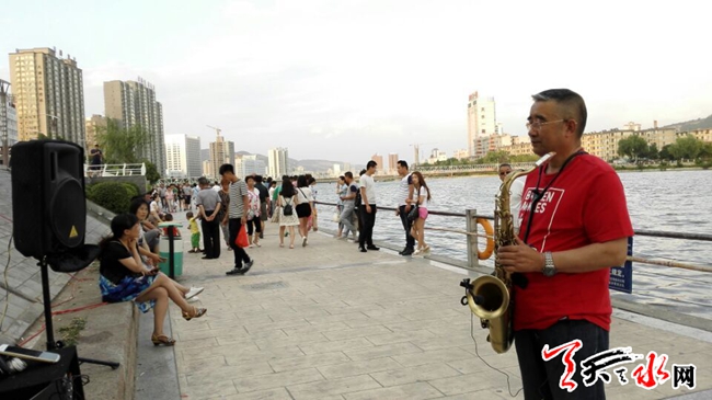 天天天水网26日18时讯【记者 张文都】暮色的霞光下,天水湖披上了金色的光芒,休闲的人流涌动。6月26日,一群音乐爱好者在天水湖畔吹奏起管弦乐萨克斯,一曲经典名曲《回家》被演绎得如梦如幻,轻快悠长的美妙旋律飘荡在上空,引得游人驻足欣赏聆听。