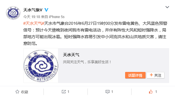 天天天水网讯 天水市气象台2016年6月27日19时00分发布雷电黄色、大风蓝色预警信号:预计今天傍晚到夜间我市有雷电活动,并伴有阵性大风和短时强降水,局部地方可能出现冰雹。短时强降水容易引发中小河流洪水和山洪地质灾害,请注意防范。