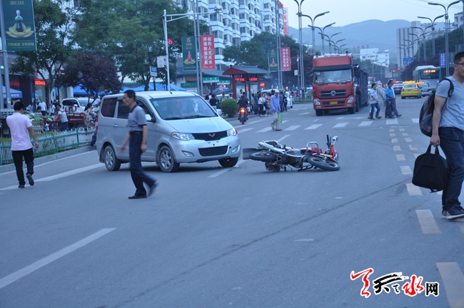 天天天水网28日9时讯【记者 常亮】6月27日晚8时许,在秦州区成纪大道绿色市场附近发生一起小轿车与摩托车碰撞交通事故,该事故造成摩托车驾驶员受伤,小轿车与摩托车不同程度受损。