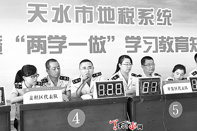 6月28日,天水市地税局举行庆“七一”暨“两学一做”学习教育知识竞赛,全市地税系统9支代表队围绕《党章》《习近平总书记系列重要讲话读本》等内容进行了踊跃竞答。(天水日报记者 孙镇 摄)