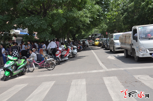 天天天水网30日15时讯【记者 常亮】6月30日中午,记者途径秦州区新华路时看到,位于新华路天水市建三小学门前已经排满了前来等候学生的家长,而门前的机动车道上则停满了家长们的交通工具,摩托车、电动车、还有少数私家车,所停放的车辆满满的占用了一个车道,车辆的乱停乱放致使公交车无法进站,一时间,学生们的打闹声、家长们的叫喊声,公交车的喇叭声乱成一片。