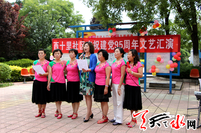 天天天水网讯(通讯员李小霞)在庆祝建党95周年之际,6月29日上午,西十里社区计生协会在社区文化广场,举行文艺汇演,党员代表、流动人口及居民群众近200人欢聚一堂,载歌载舞。