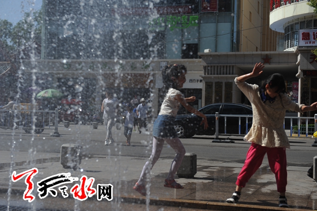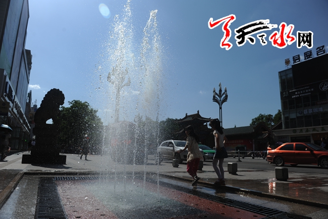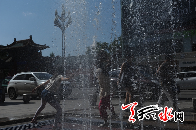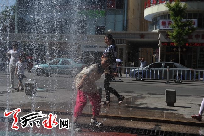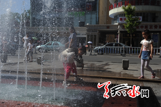 天天天水网3日18时讯【记者 杨晓斌】秦州区民主路市百货大楼前的街道喷泉边,几个孩子在戏水纳凉。当日,我市的最高气温达到33摄氏度,为今年我市入夏以来的次高温(最高气温为34摄氏度),对此,市气象部门发布了高温橙色预警,并预计近几天的气温都在33摄氏度左右,请市民们注意避暑。