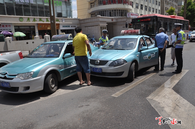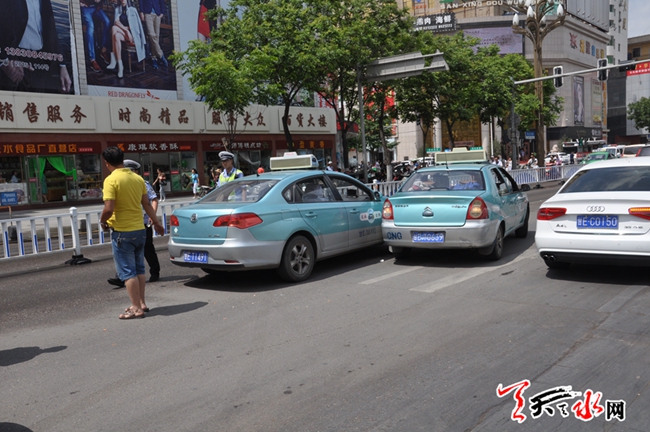 天天天水网4日12时讯【记者 常亮】7月4日中午,记者途径秦州区民主东路时看到,在民主东路百货大楼下的机动车道中间,两辆出租车发生剐擦紧挨一起,出租车一旁三两个人争吵不休。