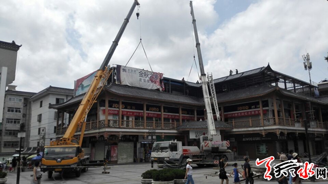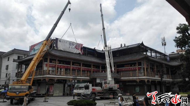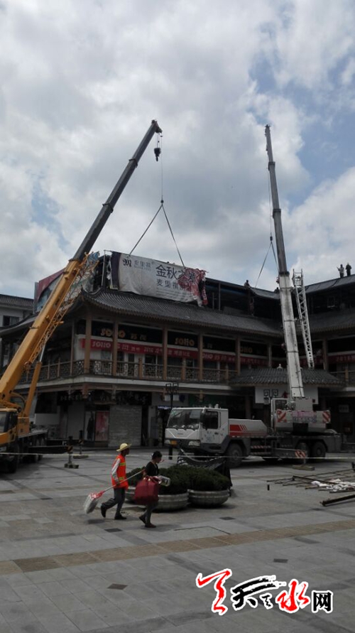 天天天水网5日14时讯【记者张文都 】7月5日,施工人员正在拆除秦州区步行街楼顶的广告牌。据了解,步行街临街楼体上的一些广告牌因年久失修,存在安全隐患,施工人员将拆除这些广告牌,并对一些楼体进行维修改造。