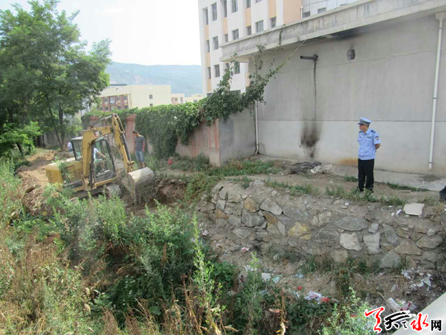 据了解,每年该河沟都是这附近排洪的主要渠道,曾在2013年出现过堵塞,引发了洪水。目前,天水地区即将进入雨季,河道内杂草丛生,建筑垃圾和生活垃圾将河道严重堵塞。区七里墩办事处、区行政执法局机动二中队和区防汛办的相关人员,动用大型工程机械对河道进行清理,确保雨季该片区排水系统的畅通。同时,也希望附近的居民爱护清理成果,加强监督,对河道内乱倒垃圾行为及时制止并举报。