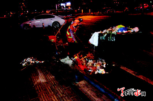▲凌晨4时,环卫工人正在清扫街边摊遗留的垃圾