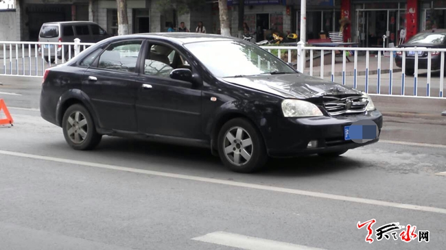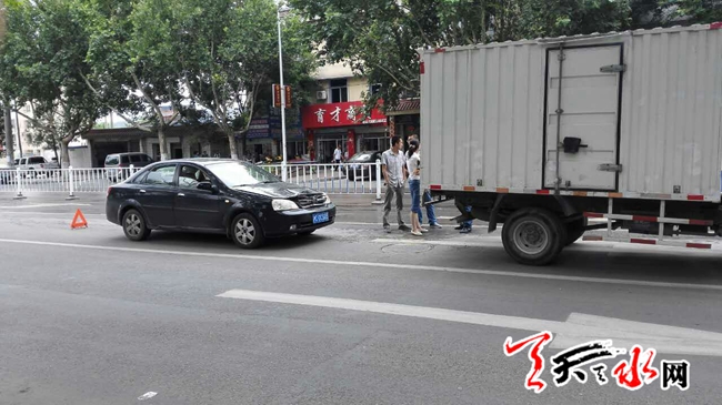 天天天水网12日10时讯【记者蔚军平】7月12日上午10时许,在秦州区岷山路与迎宾路相接的丁字路口处,我市的一辆厢式货车与上海的一辆小轿车在等候信号灯区域发生追尾,致使货车尾部与小轿车前部均有不同程度受损。