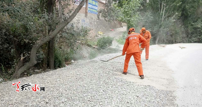 天天天水网讯 近日,秦州公路管理段养护人员正在集中清理S207线靖天路南河川路段的路面砂石。