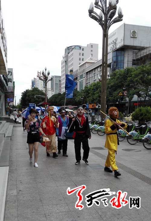 天天天水网12日17时讯 【记者 刘晓亚】话说公元2016年7月12日,唐僧师徒四人西行途经天水,天气炎热,人困马乏,无斋无食,境遇不堪,无奈中大师兄心生一计,尽诉厉害关系后,四人与一广告商合作,作起了广告形象人,还别不信,那叫一个吸晴。