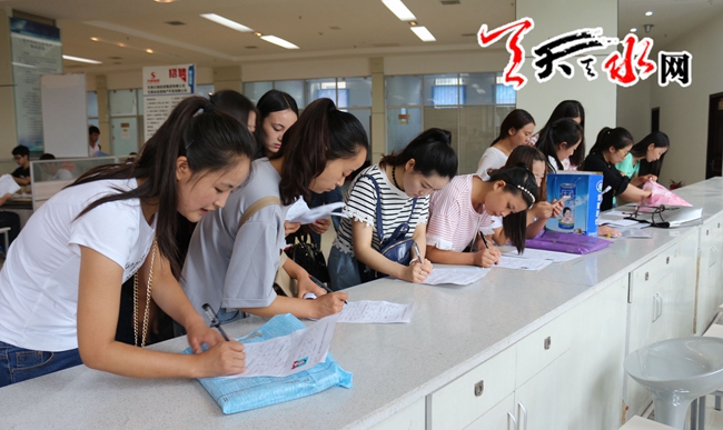 7月11日上午,在天水市人力资源市场的二楼高校毕业生报到处看到,现场人头攒动,各类高校毕业生们正忙着填写普通高校毕业生报到注册登记表,工作人员一边为他们指导,一边为他们办理报到手续。