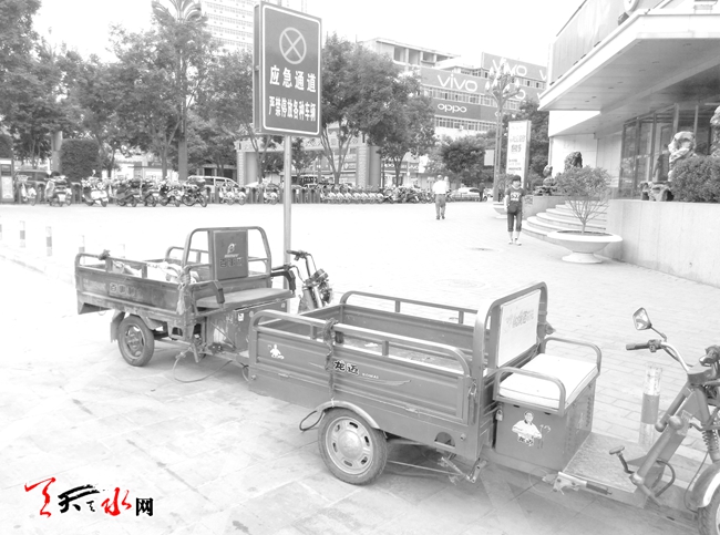 近期,相关部门对秦州区解放路忠义巷口进行了整修,并设立应急通道警示牌,严禁应急通道上停放各种车辆。可连日来记者看到,个别车主竟将两辆电动三轮车用钢丝绳紧锁在一起,昼夜停放在应急通道的禁令牌下,既给应急车辆带来了不便,又似乎在与禁令牌作对。希望有关部门制止此类霸道停车的行为。 (记者王建华 摄)