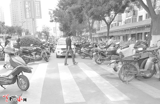 7月12日,记者在秦州区成纪大道西段看到,位于伏羲中学附近的非机动车道内横七竖八地停放着摩托车、自行车、电动汽车等,将整个道路堵得严严实实,连斑马线上也停满了车,严重阻碍了行人和车辆通行。在此呼吁市民停车别太霸道,也望交警部门加强管理,杜绝不文明停车现象。(记者常亮 摄)