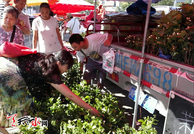 天天天水网19日11时讯 【记者 邵兰霞】7月19日,记者在坚家河花鸟鱼虫市场看到,很多花铺里增添了白色茉莉花,购买者络绎不绝。据了解,这些茉莉花10元/盆,优惠的价格和茉莉的清香吸引了市民争相购买。