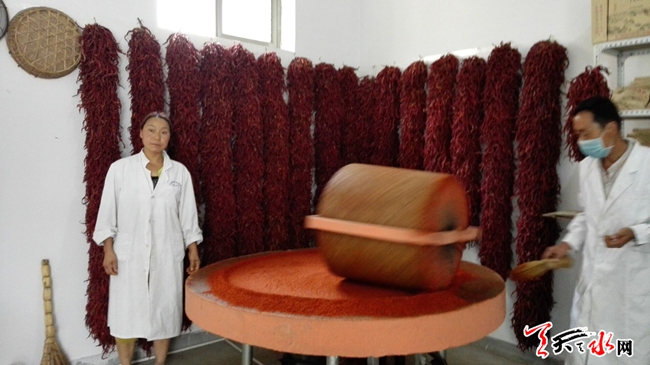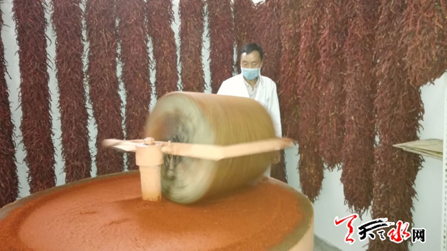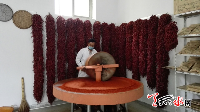 天天天水网19日18时讯 【记者 姬旺芳】7月19日,工作人员正在甘谷县磐安镇三十里铺供销综合服务社辣椒加工室磨辣椒。