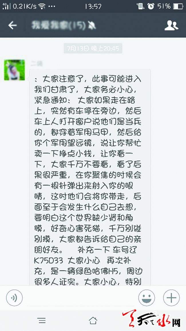 “大家如果走在路上,突然有车停在旁边,然后车上有人打开窗户说他们是当兵的,都穿着军用马夹,然后给你个军用望远镜,说让你帮忙卖一下挣点小钱。让你看一下,大家千万不要看,看了后果很严重,在你对焦的时候会有一根针弹出来射入你的眼睛,这时他们会将你带走,后面至于会发生什么自己去想,要明白这个世界缺少肾和角膜,好奇心害死猫,千万别碰别摸,大家都告诉给自己的亲朋好友。补充一下车号为辽K75D33,大家小心,再次补充是一辆绿色哈佛H5,周边很多人证实。大家小心,特别是那种一个人在马路边等了很久的,那些人其实早就注意到你了,花上几秒钟转发一下。一定要告诉自己的亲人和小孩!互转、接力、爱心!”