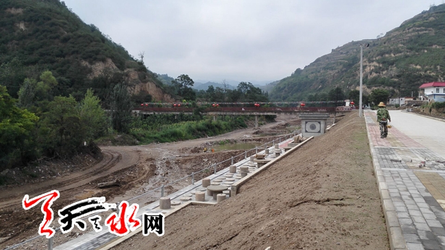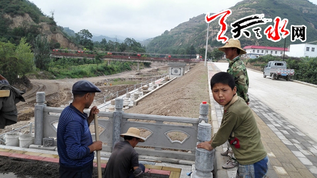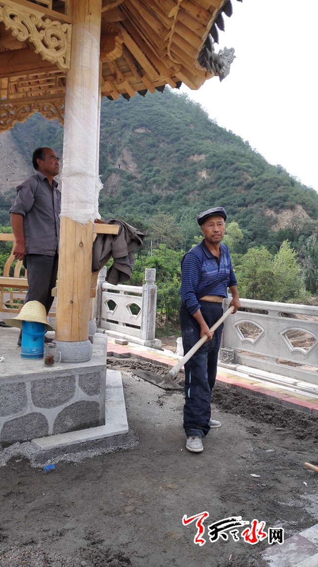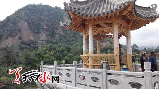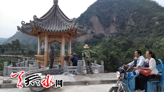 天天天水网23日14时讯【记者 苏中豹】23日下午,在秦州区太京镇二十里铺村口,一条初现雏形的仿古街展现眼前,几位村民正在景区一座新建的亭子里处理地面,亭后背靠的便是古秦州八景之的佛公桥景区。