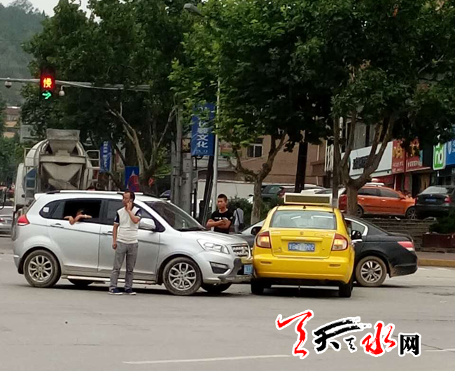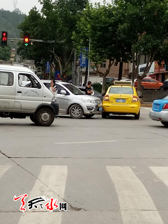 天天天水网 23日14时讯 【记者 甄娜】天水郡十字,一辆出租车与一辆左转弯的私家车相撞,两辆车主下车查看了碰撞情况,各自打电话求助。事故造成小范围拥堵,在这里提醒各位司机朋友,出行请遵守交规,安全行车。