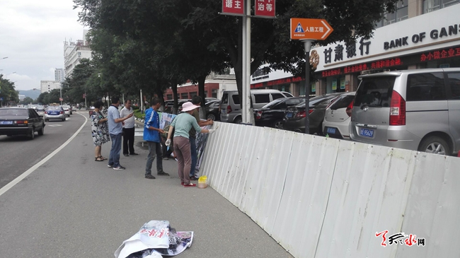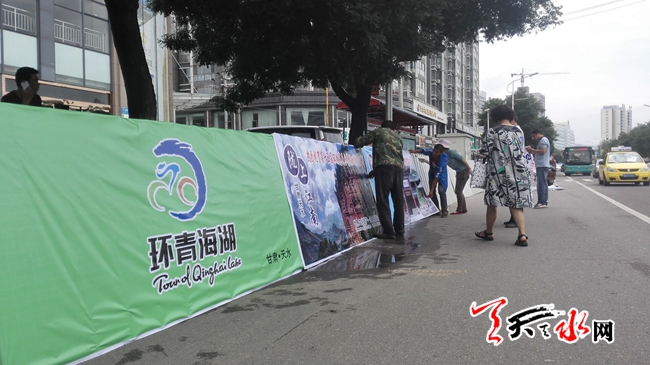 天天天水网25日15时讯 【记者 刘晓亚】第十五届环青海湖国际公路自行车赛天水赛段比赛发车在即,做为一项有较高国际知名度的赛事,其所带来的宣传效应是具有很强的“蝴蝶效应”的,做好赛事期间对天水的宣传是赛事必不可少的重要环节,25日,相关部门开始在赛道护栏上张贴宣传广告。