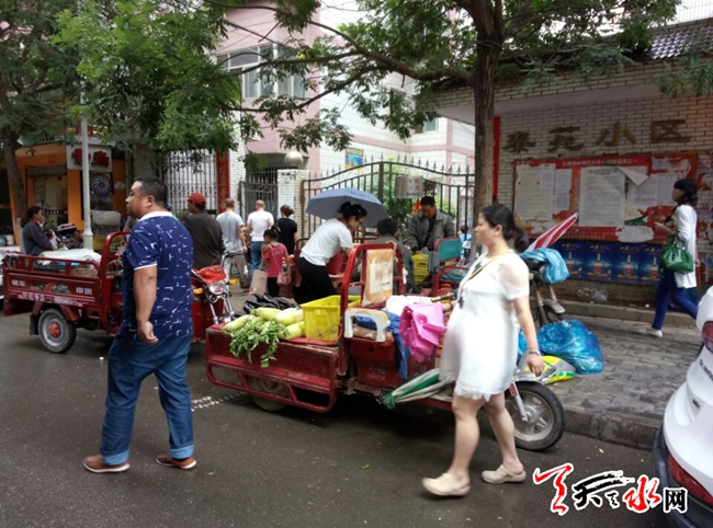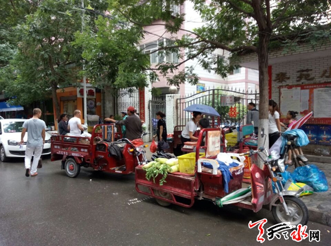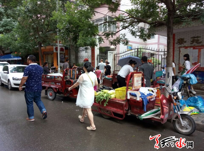 天天天水网26日20时讯【记者 何慧娟】7月26日,记者在秦苑小区门口看到,一些卖水果、蔬菜小摊贩聚集在小区门口摆摊,自发形成了马路市场,有的车辆甚至停在人行道上,导致过往的行人只能绕行。