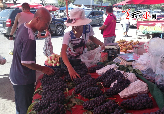 天天天水网28日15时讯 【记者 邵兰霞】7月28日,进入夏季,本地水果开始大量上市,我市三阳川的葡萄以味美肉厚多汁受到市民广大市民的喜爱,记者在各大果蔬市场看到, 三阳川的葡萄卖到4元左右一斤,而且销售很快。