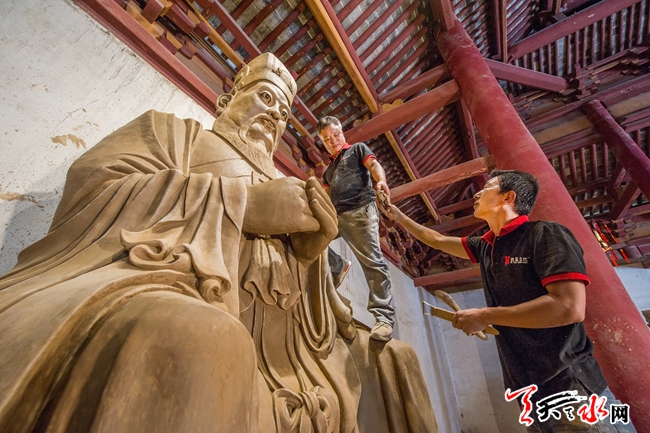 7月27日,泥塑工艺师在天水市文庙大成殿修改已近完成泥塑部分的大成至圣文宣王孔子的泥塑彩绘像。泥塑彩绘像是文庙大成殿保护修复工程的一部分,共塑有一尊主像,四配像及十二哲像。主像坐高3.36米,头戴十二旒冠冕,身穿十二章王服,手捧镇圭。全部工程预计2017年5月竣工。(天水日报记者年葆东 摄)