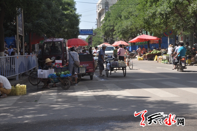 天天天水网29日14时讯【记者 常亮】7月29日中午,记者在秦安县城内看到,位于兴国路的道路两侧已被在这里做生意的商贩占了个严严实实 ,商贩们推着放满蔬菜水果的三轮车在整条街道上随意摆摊设点,当时正值中午下班的高峰时期,在此过往的机动车、自行车混杂在一起同行,这样肆意占到经营,对于该路段的交通有着严重的影响,而且对在此骑车过往市民的人身安全也有着很大的威胁,希望有关部门能够加大对该路段交通的有序管理,恢复街道的畅通,让市民出行安全得以保障。