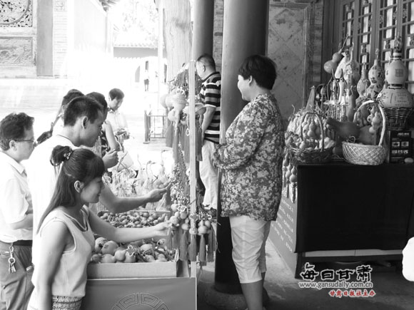 “自从2011年以来,北京有位老太太每年都要来一趟伏羲庙拜谒‘人宗爷’ , 返回时每次都要带个‘伏羲葫芦’回去。 ”说起游客对葫芦的喜好,李仙笑着说。