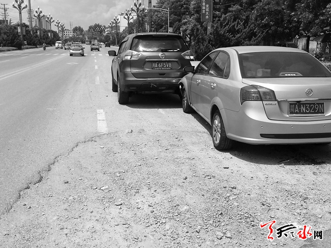 就在此处,两辆外地车发生追尾。其中一名王姓的车主告诉记者,他们两家是结伴自驾车来天水旅游的,发生这种事真是不痛快,没有想到,在天水的城市主干道上路面严重破损,也不设置警示牌,这件事让他对天水的印象大打折扣。