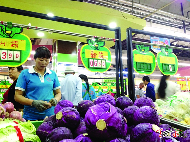 7月29日,记者在秦州区森美购物广场成纪店超市看到,黄瓜、西红柿、线椒、大白菜、豆角等作为特价菜,被摆在了显眼位置,方便市民朋友选购。“这几天,叶菜便宜了。”一位超市工作人员对记者说。