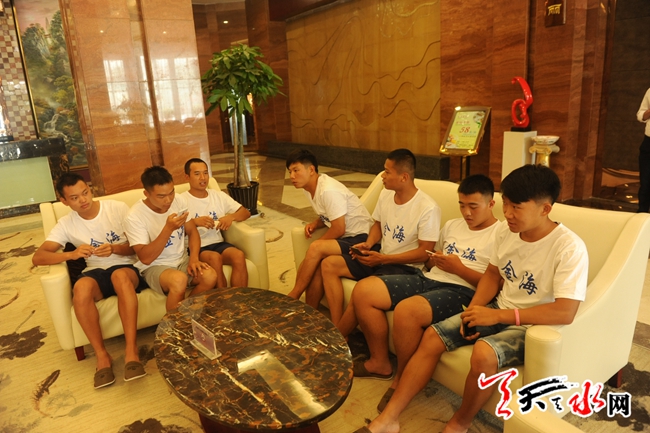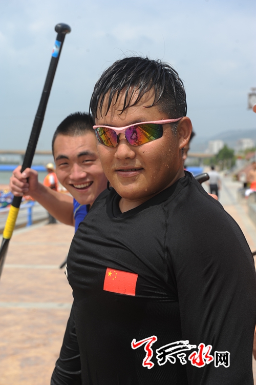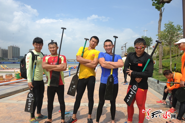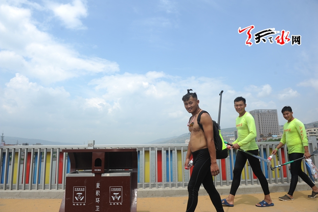 天天天水网4日15时讯 【记者 杨晓斌】8月4日,在麦积区翠湖公园,参加2016年中国龙舟公开赛(甘肃·天水·麦积站 )暨中国·天水·麦积第二届“伏羲杯”龙舟大赛的山东聊城选手在翠湖中试水训练,训练完毕后走向他们下榻的麦积区地质宾馆。