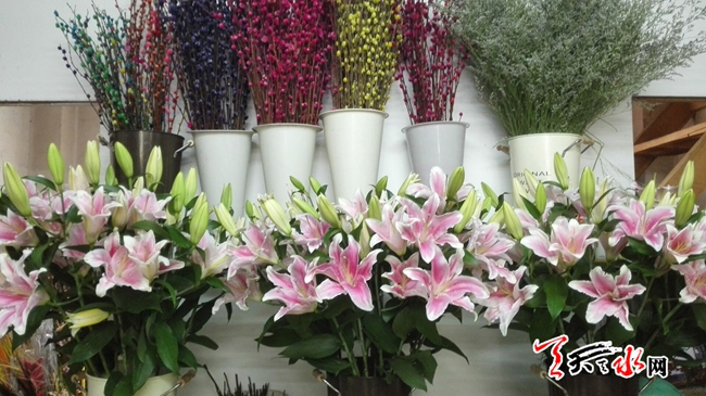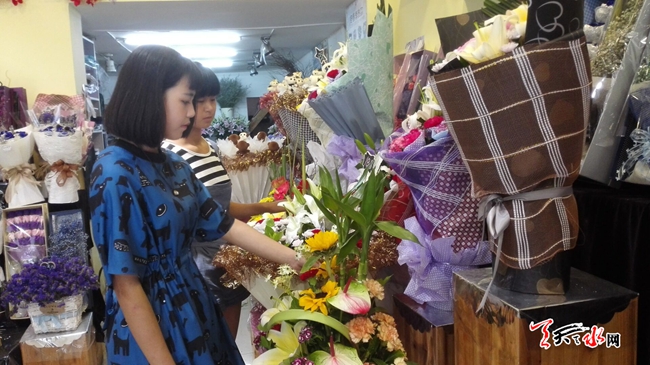 天天天水网5日16时讯 【记者 邵兰霞】8月5日上午,民主路鲜花店在准备“七夕”节的花束。