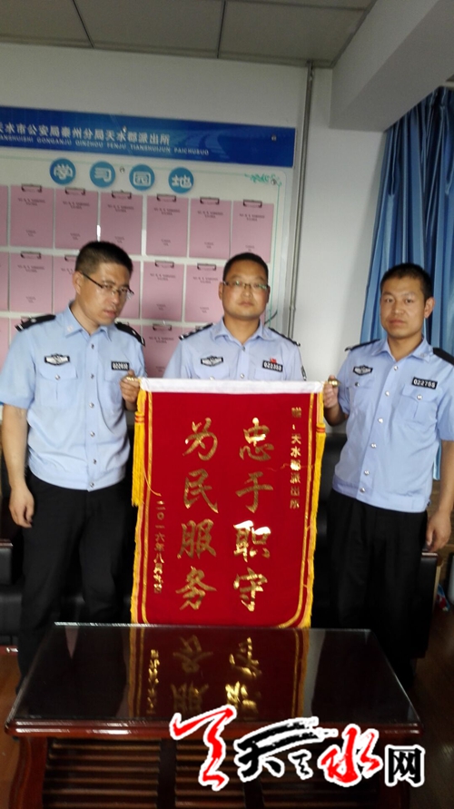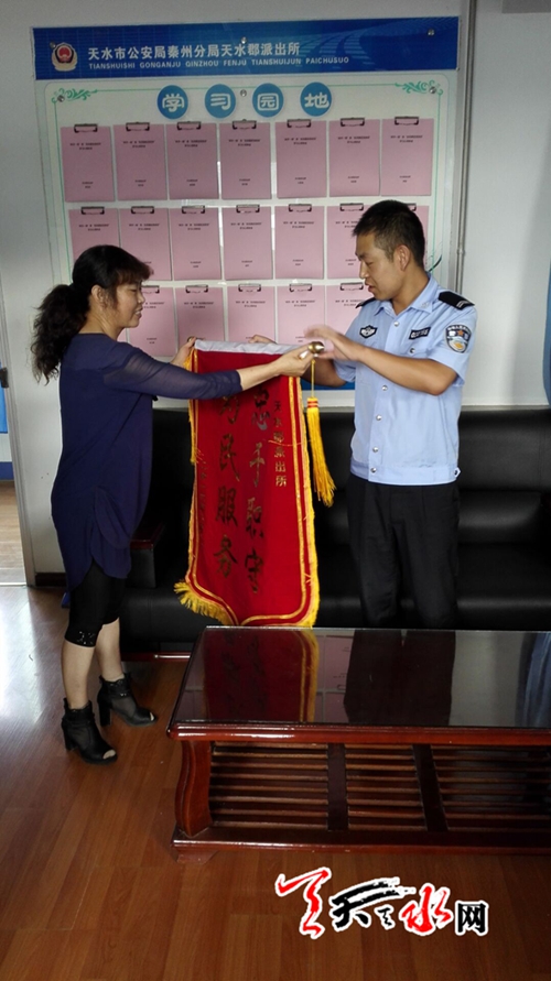天天天水网8日16时讯 【记者 杨晓斌】8月8日16时许,秦州公安分局天水郡派出所,一位家长将一面锦旗送至民警手中。8月7日,孩子因贪玩忘了回家,家长报案后派出所民警帮助找到了孩子。今日下午,为感谢民警的帮助,家长特送来锦旗。