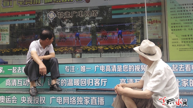 天天天水网9日12时讯【记者 王雪梅 】8月9日10时许,在我市民主路甘肃广电网络的橱窗外聚集了不少市民观看奥运会直播。