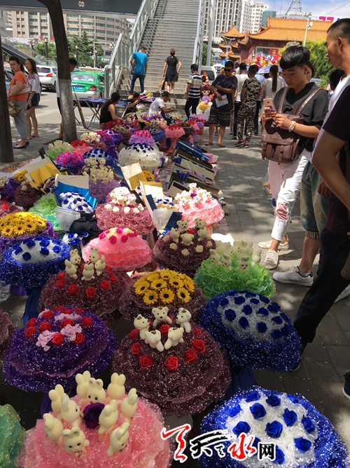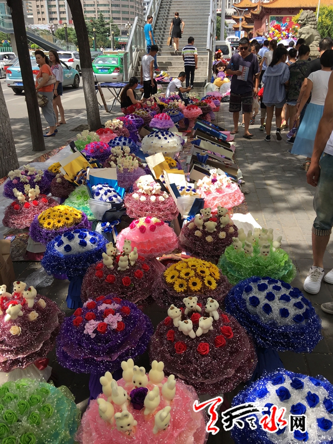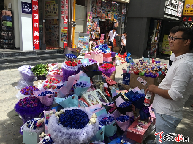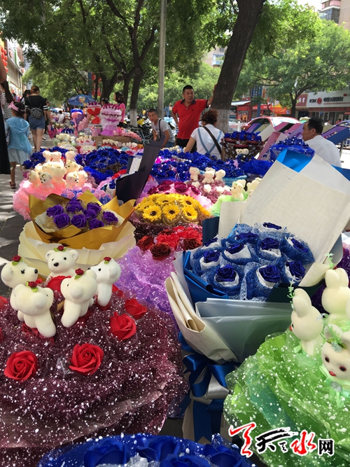 天天天水网9日14时讯【记者甄娜】今天是七夕节,各式各样的花束将秦州区大众路形成了一条长长的花海,这些花束从四五百元到八九十元不等,卖花的摊主都称,今年七夕花束价格比去年便宜,不过卖花的人比买花的人多,从早上十点摆摊到现在仅卖出了两枝独立包装的单枝花,现在只能把卖花的希望寄托到晚上了。
