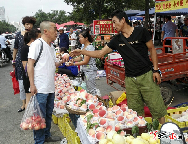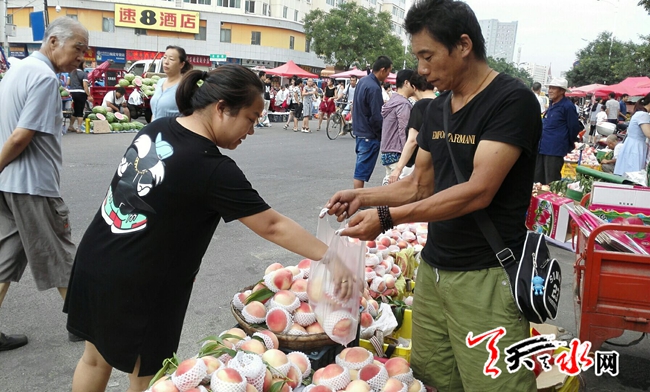天天天水网9日17时讯【记者 邵兰霞】8月9日上午,随着秦安蜜桃“北京七号”的大量上市,一些市民专门到罗峪小区、坚家河花鸟市场、绿色市场、长途车站、东团庄等地寻找卖“北京七号”的果农。